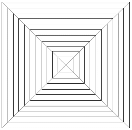 - CN: COMPLETE (obliques + squares) EQUIDISTANT “NO PERSPECTIVE” GRID: The pyramid texture was composed of oblique black perspective lines, starting from the pyramid vertex to its base, modulated according to the perspective laws (i.e., very thin near the vertex and gradually becoming thicker), plus vertical and horizontal orthogonal lines (squares) that were equidistantly spaced, and the lines were all of the same thickness (see Figure 2).