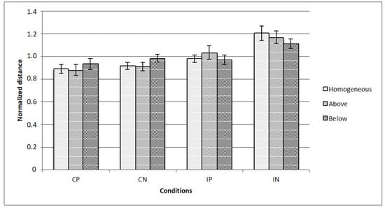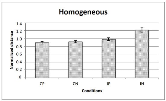 The figure represents the data for homogeneous illumination: The horizontal axis represents the experimental conditions (i.e., CP, CN, IP, IN), while the vertical axis is for the normalized critical distance (i.e., averaged across observers). Standard errors are reported.