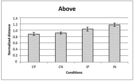 The figure represents the data for the illumination from above: The horizontal axis represents the experimental conditions (i.e., CP, CN, IP, IN), while the vertical axis is for the normalized critical distance (i.e., averaged across observers). Standard errors are reported.
