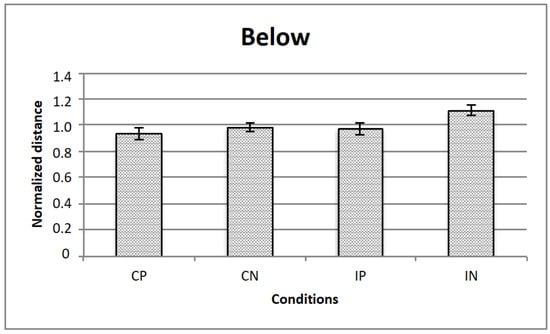The figure represents the data for the illumination from below: The horizontal axis represents the experimental conditions (i.e., CP, CN, IP, IN), while the vertical axis is for the normalized critical distance (i.e., averaged across observers). Standard errors are reported.