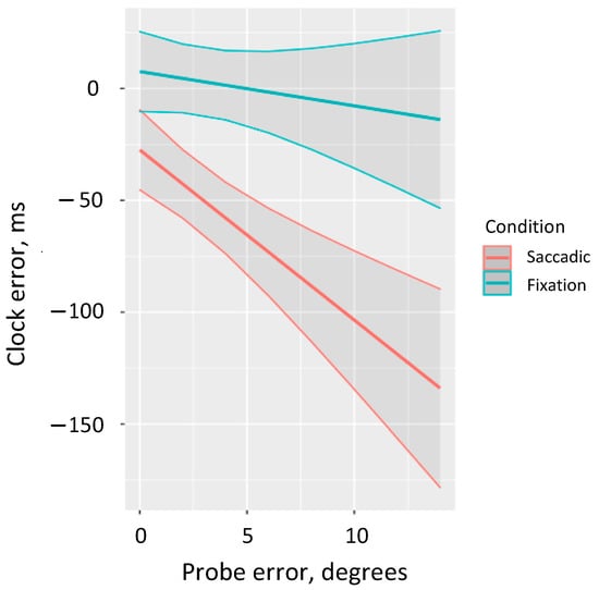 We performed a more detailed analysis of the interaction between saccade condition and Euclidean distance error to consider the marginal predicted performance in the clock task depending on the error size in the localization task (ggpredict from the package ggeffects [48]). The results revealed that accurate clock predictions are observed in the fixation condition across the full range of probe errors. By contrast, in the saccadic condition we observe decreased performance in the clock task and we observe greater negative clock errors as localization error increases (in the full range we observe underestimation) (Figure 3).