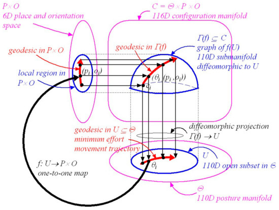 In essence, because the mass-inertia matrix is the kinetic-energy Riemannian metric on the posture manifold , all geodesics computed using will be confined to the 110D posture manifold . However, because the local map between and is either a constant map or a smooth one-to-one map it follows that, locally at least, the geodesic in posture space either leaves the place and orientation of the head unchanged or it carries the place and orientation of the head along with it in a one-to-one fashion. Thus a geodesic trajectory in maps diffeomorphically onto a geodesic in the submanifold . Locally at least, where the map between posture and the place and orientation of the head is fixed, the geodesic in the posture manifold and the geodesic in the submanifold are equivalent (i.e., they map diffeomorphically onto each other).