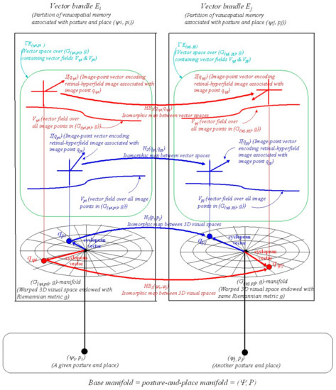 Analogous to the efficient storage of each street-view image, each posture-and-place-encoded retinal-hyperfield image at each image point in the submemory is encoded efficiently as a vector of real numbers (i.e., image-point vector) that removes redundancy from the hyperfield image. For a detailed description of this encoding process based on singular value decomposition see ([6] Section 2.7 and Appendix A). This representation of encoded retinal-hyperfield images as image-point vectors associated with image points on the surfaces of visible objects in the environment and on the visible surfaces of the body facilitates the description of the posture-and-place-encoded visual memory as a Riemannian structure. Our full Riemannian geometric account of this memory is given in Section 4.3.