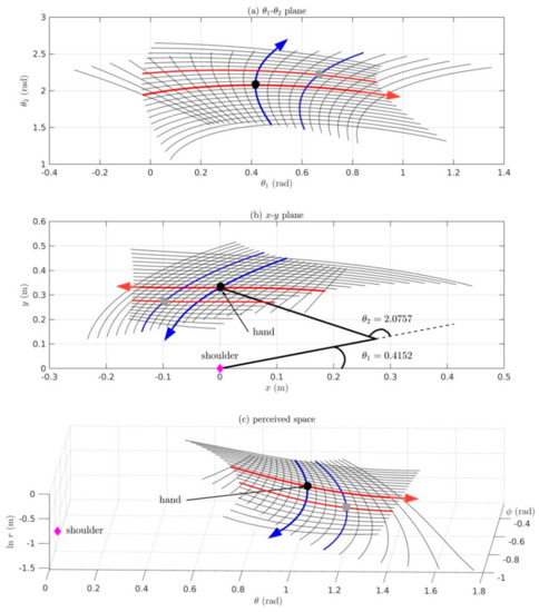 Section 6: Here we present the Riemannian geometry of proprioception-to-vision and vision-to-proprioception maps taking into account redundancy between the many elemental movements of the body sensed proprioceptively and the three dimensions of visual space. We include a Matlab/Simulink simulation of a two-DOF arm moving in the horizontal plane to illustrate that, despite nonlinearities and redundancies and the nonlinear warping of both posture space and visual space, minimum-effort movements of the two-DOF arm can be mapped in a one-to-one, onto and invertible fashion into 3D visual space.