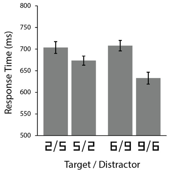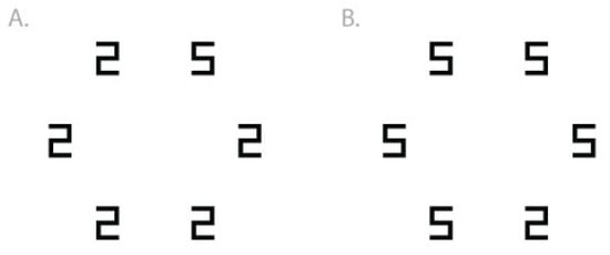 However, there is also reason to believe that these magnitude effects are not due to quantity per se, but also the visual features of the numeric stimuli. More recent studies have demonstrated that number symbol comparison effects can be explained by the physical dissimilarity of comparison digits, rather than just the quantity difference between them [,,,]. The ideal test of automatic quantity activation during numeric symbol comparison would involve judgments between digits that are composed of equivalent visual features. Conveniently, such comparisons are possible using the line-segment forms of the numbers 2 and 5 and the numbers 6 and 9. These number pairs have equivalent visual features, differing only in their orientation. However, traditional numeric distance paradigms should find no difference when making comparisons within each of these pairs (comparing 2 and 5 and comparing 6 and 9), because the numeric distance between members of both pairs is 3.