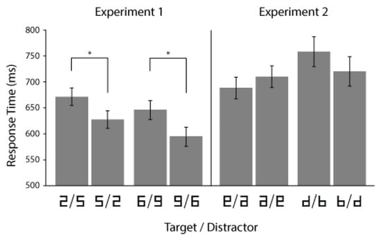 Furthermore, pairwise within-subject t-tests on response times (looking only at target-present trials with correct responses) found no significant differences in response times between the two stimulus pairs. Neither a search asymmetry between flipped 6 and 9 stimuli (p = 0.332) nor between “b” and “d” stimuli (p = 0.214) was observed. While these null results do not provide positive confirmation of symbolic magnitude effects on visual search, they nevertheless suggest that differences in search times observed in Experiment 1 cannot be explained simply by differences in the orientation or the frequency of natural occurrence of comparable stimuli.