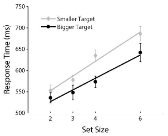 Response time during target-present trials in Experiment 3 as a function of set size. The gray markers (“Smaller Target”) combine searches for a 2 among 5s and s 6 among 9s. The black markers (“Bigger Target”) combine searches for a 5 among 2s and a 9 among 6s. The least squares linear trend line is shown for each of these conditions. Error bars indicate 95% within-subject confidence intervals.