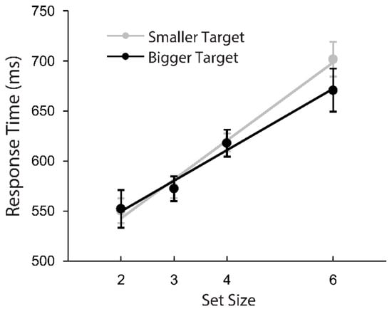 In keeping with [], only target-present trials were considered, because the goal of this analysis is to determine whether the quantity of distractors moderates the search asymmetry specifically during target detection. There were no significant response time differences between participants who responded to 2/5 or 6/9 stimuli (p = 0.744) or between block orders (p = 0.801). There was a main effect of set size, as increasing the number of items in the search array increased response time, F(3,16) = 30.287, p < 0.001, ηp2 = 0.866. There was also a main effect of target size, as participants were again faster to find a numerically larger target among numerically smaller distractors, F(3,16) = 14.523, p = 0.002, ηp2 = 0.476. The interaction between set size and target size was marginally significant, F(3,16) = 3.598, p = 0.041, ηp2 = 0.435, but as illustrated in Figure 3, the target size effect is not completely eliminated with set sizes of 2 or 3 items. On the contrary, a post hoc within-subject paired t-test, limited only to set sizes 2 and 3, finds that participants were still faster to find larger targets than smaller targets, t(19) = 2.762, p = 0.012. For finding smaller targets, the search function increased by 34 ms per additional distractor, and for finding larger targets, the increase was 27 ms per distractor; the difference between these estimated slopes for individual subjects was not significant (p = 0.146).