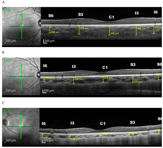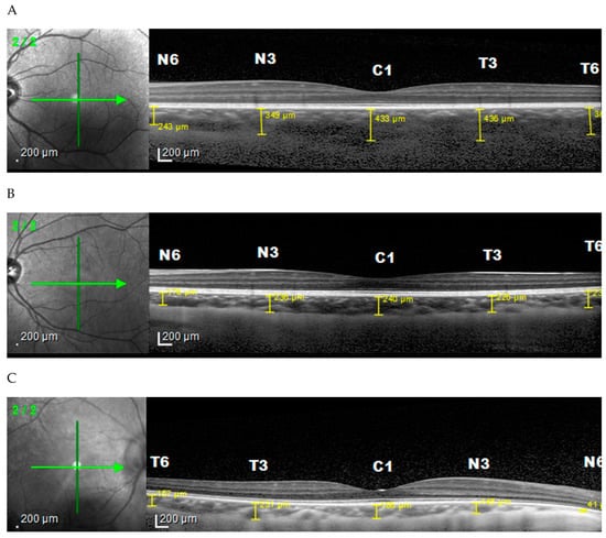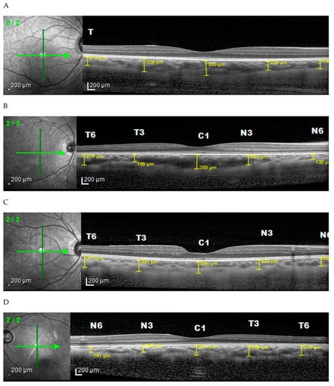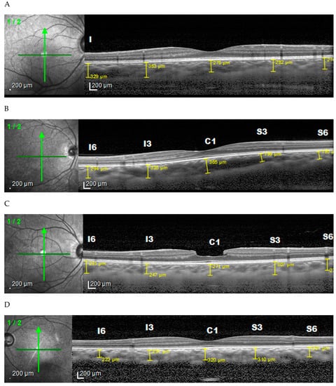 Another study by Deng et al. (2018) showed that the mean CT in the perifoveal, parafoveal, and central foveal regions where 215 ± 50 µm, 227 ± 60 µm, and 229 ± 65 µm, respectively, while the mean spherical equivalent (SE) of the patient was −1.71 ± 2.22 diopter (D) (range from −7.63 to 4.25 D). Furthermore, the mean global peripapillary choroidal thickness (PPCT) was 136 ± 33 µm [].