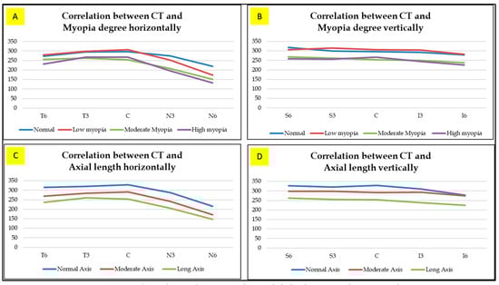 In a cross-sectional study by El-Shazly et al. (2017), Macular CT was measured in different degrees of myopia and in normal control eyes, and a similar result was obtained, which is significantly lower in myopes than in emmetropes. Moreover, it varies by location, where the thickest CT in low myopic eyes is found in the subfoveal area, while the thinnest is located in the nasal region. However, for eyes with moderate myopia, the thickest is found in the temporal region, while the thinnest region remained in the nasal direction [].