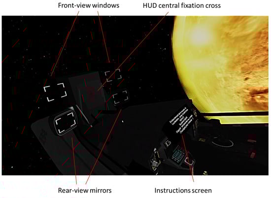11] and are recalled below. Participants were placed in a virtual space environment inside a fighter-like “spacecraft” (see