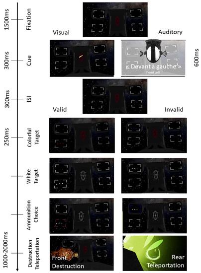 After a 300 ms ISI, the target appeared in one of the 4 possible locations. If participants’ gaze left the fixation point before the target appeared, a new trial was launched. Once the target appeared, participants had to destroy it following the instructions described above. After the destruction of the target, a variable time interval of 1 s to 2 s occurred. The experimental phase consisted of 80 trials: 40 trials per cue type (visual/auditory), divided into 20 non-predictive trials, 10 valid trials (5 front and 5 rear), and 10 invalid trials (5 with target occurrence to the front and 5 to the rear) and 20 predictive trials (10 front and 10 rear). The total duration of the experiment was 30 min, including an experimental session of at least 20 min. This duration was chosen because of virtual reality constraints (eye strain, cybersickness, discomfort) so the participants would go through the experience in the best possible condition without impacting their attention processes. Before the experimental phase, participants performed 16 trials as training (4 trials per cue type and predictivity blocks) to make sure that the instructions were well applied and that they became used to the cues provided.