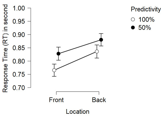 The results show the main effect of the target location. Participants reacted more quickly when the target appeared through the clear windows (front) rather than in the rearview mirrors (rear). Similar to the results of [