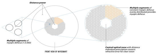 The DIMS lens consists of polycarbonate with a refractive index of 1.590 and a spherical design, except for the mid-peripheral defocus area; Figure 1 shows a diagram of the optical design of a DIMS lens. DIMS lenses were provided by Hoya Co., Ltd. (Tokyo, Japan). The clear vision zone in the middle of the DIMS lens corresponds to the wearer’s central refractive power, and has a diameter of 9.4 mm. The mid-peripheral zone, also called the treatment zone, is made up of a honeycomb design area with a 50:50 area ratio between the clear vision area with the center refractive power (area between the unfilled circles) and the +3.50 diopters myopic defocus (unfilled circles), composed of 396 tiny lenslets, reaching a total of around 33 mm in diameter [52], as shown in Figure 1.
