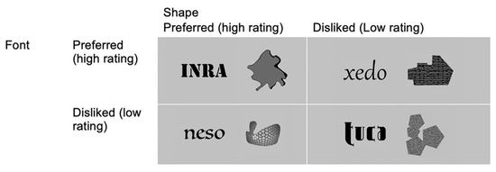 In this study, we manipulated the preferred vs. disliked qualities for both shapes and fonts for object-word pairs. To minimize the potential semantic associations of familiar objects and words on the perception of shapes and fonts (e.g., [17]), only abstract objects and pseudowords were used in this study. If observers evaluate information from both objects and words equally, and the effects of preferred vs. disliked visual qualities from both categories are addictive, the highest preference ratings would be expected for object-word pairs with preferred shapes and fonts, whereas the lowest preference ratings would be expected for the pairs with disliked shapes and fonts. Another possibility is that the congruency between the shape and font qualities of the object-word pairs is also evaluated (e.g., see [28]), thus higher preference ratings would be expected for object-word pairs with preferred qualities for both components and for pairs with disliked qualities for both components, compared with pairs with preferred qualities for one component but disliked qualities for the other component. Alternatively, preferences and response times for object-word pairs might instead be driven by the visual qualities of only one but not both components, presumably the first component that observers attend to.