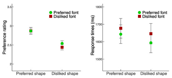 An ANOVA was conducted on RT with three within-subject factors: Shape quality (preferred vs. disliked), Font quality (preferred vs. disliked), and Position (left vs. right of center of screen). There was a main effect of Shape quality, F1,23 = 5.00, p = 0.035, ηp2 = 0.18, with slower responses for preferred shapes than disliked shapes. There was also a main effect of Font quality, F1,23 = 5.61, p = 0.027, ηp2 = 0.20), with faster responses for preferred fonts than disliked fonts. The main effect of Position was not significant, F1,23 = 1.80, p = 0.19, ηp2 = 0.072. There were no significant two-way interactions (Shape quality Font quality: F1,23 = 0.27, p = 0.61, ηp2 = 0.012; Shape quality Position: F1,23 = 0.1, p = 0.749, ηp2 = 0.005; Font quality Position: F1,23 = 2.24, p = 0.148, ηp2 = 0.089) or three-way interactions (F1,23 = 3.46, p = 0.076, ηp2 = 0.13).