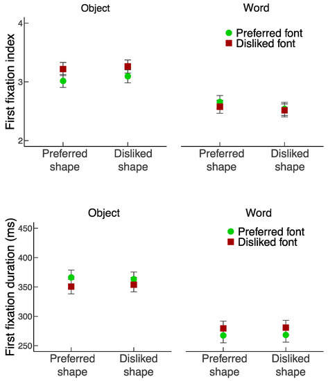 To examine how attention might be allocated to either the object or the word with different visual qualities, eye movements were recorded during the preference judgment. We focused on the measures of first fixations and total fixations towards the object-word pairs. Previous studies showed that observers’ first fixations and total fixation durations for pictorial or textual components depend on the relevance to their goals [29]: observers generally attended to the text over the image quicker and for a longer time on printed or webpage advertisement when considering making a purchase [30,31], but attended to the image quicker and for a longer time, compared with the text, when judging how much they liked the ad or how effective the ad was [32]. Based on these findings, we expected that when making the preference judgment of object-word pairs, the shape qualities might have a larger impact than font qualities, since the object might be fixated first and for a longer time, compared with the word. Moreover, differences in eye movements might also be expected between preferred and disliked qualities of shapes and fonts, since observers might be more likely to attend to preferred shapes and avoid attending to disliked shapes [8,33], but might be less likely to attend to preferred than disliked fonts [34,35,36].