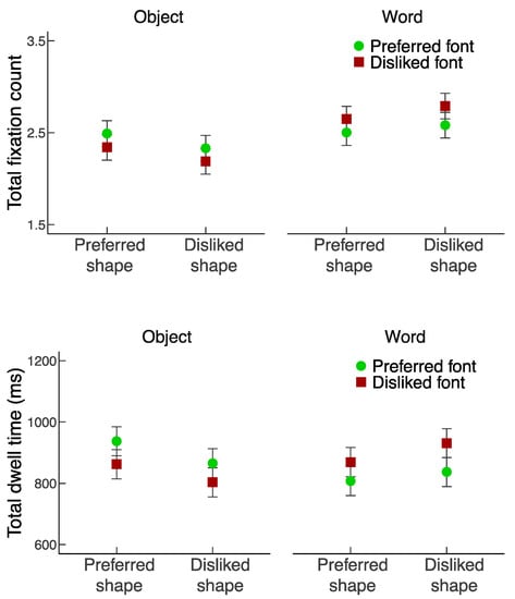 Nonetheless, both shape and font qualities had an impact on the evaluation process, as the response times for the preference decisions were influenced by both sets of qualities. More specifically, preferred vs. disliked shape and font qualities showed different effects, with longer response times found for preferred than disliked shapes and for disliked than preferred fonts. Although no differences in response times were observed for either shapes or fonts during the pilot study, it is important to emphasize that because opposite patterns of response times and total fixations were observed for preferred vs. disliked shape and font qualities, it is unlikely that the same factors affect the processing of objects and words equally. Presumably, preferred shapes are more pleasant to look at compared with disliked shapes [8,12,13,33], while it may take longer to identify the words shown in disliked than preferred fonts (e.g., [10]). Similar differential effects of preferred vs. disliked shape and font qualities were also revealed in two of the eye movement measures, specifically the total fixation count and total dwell time. Taken together, these results suggest that shape and font qualities do not produce identical effects on either preference ratings or processing time, and the amount of processing time for specific shape and font qualities is unlikely related to subjective preference for object-word pairs.