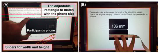 Participants entered their phone size by physically placing their smartphone on their screen over a black rectangle and then adjusting the rectangle size using sliders—width and height (see