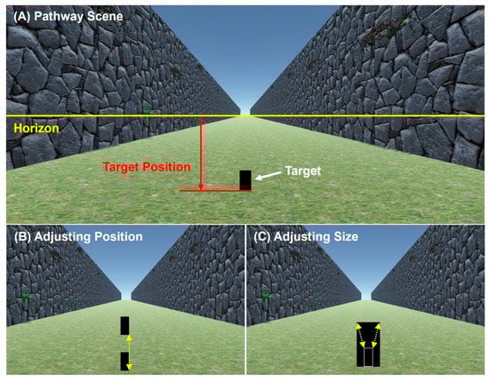 Figure 4A). The scene was designed to provide limited distance information (i.e., stones on the walls are of unfamiliar shape and size, and there are no other objects in the scene other than the target) so that the observer could focus on the target itself when determining its size/distance. Because the screen sizes and ratios varied between participants, the width and the height of the scene was kept at a 9:5 ratio, where the height of scene rendered on the screen was always the full height of the screen. For most screens, this produced a full screen image.