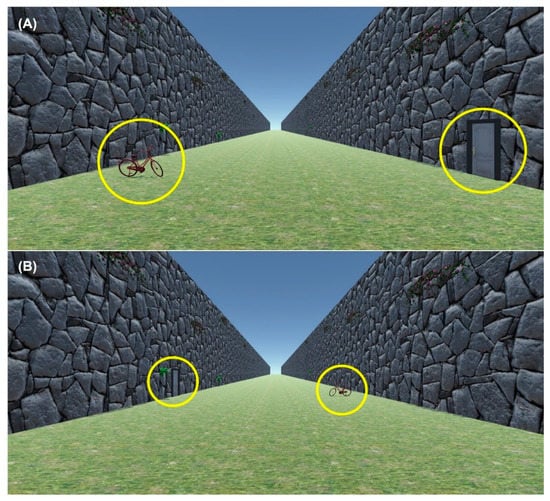 The test procedures were similar to Exp 1 and 2 except the 2D pathway scene had familiar objects added to the scene. The familiar objects used were a bicycle and a door. They were either near (at 8 m) or far (at 16 m) from the observer in the rendered scene (see
