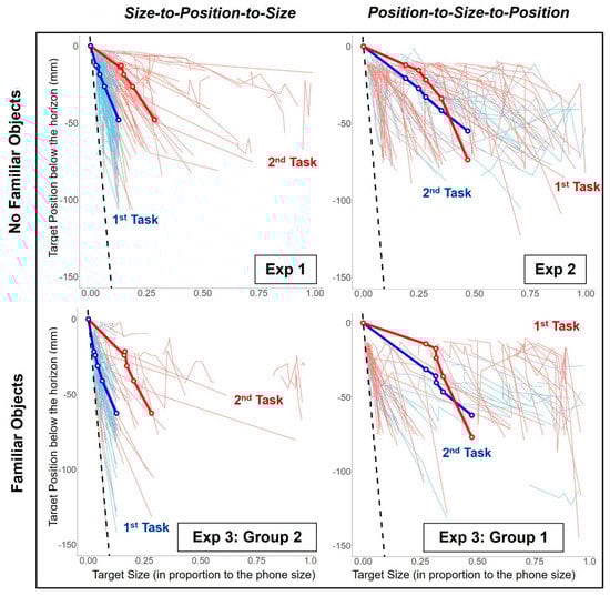How well our participants performed on the tasks we set them depended, unexpectedly, on the order in which they performed them. The targets positioned based on their size, the Size-to-Position task, were more geometrically accurate compared to the target sizes chosen for a given position, the Position-to-Size task, when they performed the Size-to-Position task first (i.e., blue lines were closer to the dashed line compared to the red lines in