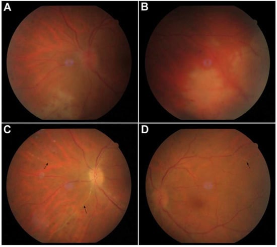 - Patel, A.; Pomykala, M.; Mukkamala, K.; Gentile, R.C. Kyrieleis plaques in cytomegalovirus retinitis. J. Ophthalmic Inflamm. Infect. 2011, 1, 189–191. [Google Scholar] [CrossRef] [PubMed] [Green Version]