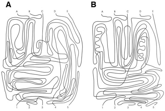 Following the original instructions [3], the GVT test is composed of two cards of 216 × 279 mm (i.e., US letter size, Figure 1). Each card consists of five separate intersected continuous lines in a twisted pattern. The task consists of rapidly and accurately “following with the eyes” each line without losing it. The task requires starting from each of the letters at the top of the page (A, B, C, D, and E), following the line from the letter to the corresponding number at the bottom of the page (1 to 5), and naming the number. The corresponding number and the execution times are both recorded. As a pre-test, the demonstration card is shown to the participant, and the instructions about the start, intersections, and ends are explained carefully. The demonstration card is intended to enable the instructions to be understood and to check that the subject possesses the minimum skills required to execute the test. When a participant could not follow a single line on the demonstration card correctly after three attempts, testing was halted because the required level of the minimum skill had not been attained.