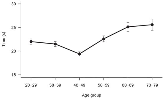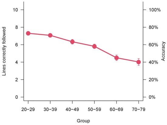 The descriptive data of the sample acquired are reported in Table 2. The results of the one-way ANOVA on accuracy were significant (F(5,520) = 21.54, p < 0.001, η2p = 0.17). This result was confirmed by the non-parametrical Kruskal–Wallis rank-sum test (χ2(5) = 83.25, p < 0.0001). The accuracy decreases over age groups, as illustrated in Figure 2.