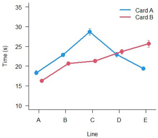 The results of LMM ANOVA show a significant main effect of Card (F(1,2761) = 7.89, p < 0.005), a significant main effect of Line (F(4,2770.4) = 79.67, p < 0.001), a significant main effect of Group (F(5,485.9) = 8.27, p < 0.001) and a significant interaction Card × Line (F(4,2759) = 53.12, p < 0.001). No other interactions were significant. The results are shown in Figure 4 and Figure 5. The execution times are different between all lines and cards and, overall, they change with age.