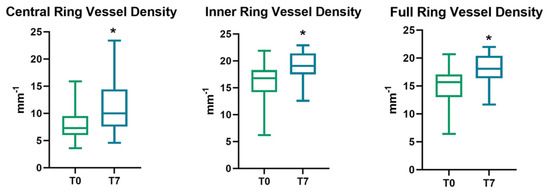 Evolution of SCP vessel density parameters (expressed as the mean ± SD) at follow-up, with an asterisk to indicate a significant variation. SCP = superficial capillary plexus; T0 = baseline values; T7 = 1-week follow-up.