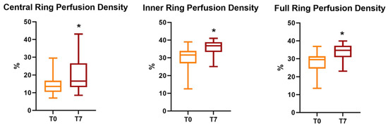 Evolution of SCP perfusion density parameters (expressed as the mean ± SD) at follow-up, with an asterisk to indicate a significant variation. SCP = superficial capillary plexus; T0 = baseline values; T7 = 1-week follow-up.