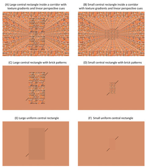 We presented a central rectangle composed of bricks in a corridor rich in texture and linear perspective depth cues (Figure 2A,B), a central rectangle composed of bricks on a uniform background (Figure 2C,D) and a central rectangle of a uniform colour on a uniform background (Figure 2E,F). The central rectangle was presented either in large (Figure 2A,C,E) or small (Figure 2B,D,F) sizes, corresponding to positions in the front and the back, respectively, of the corridor background. The large central rectangle had a height and width of 9.8 and 5.2 degrees of visual angle, respectively (Figure 2A,C,E). The small central rectangle had a height and width of 3.5 and 1.8 degrees of visual angle, respectively (Figure 2B,D,F). The central rectangle with bricks was created using a high-resolution, seamless brick wall image as a texture cue. A single brick had a height and width of 0.5 and 1.4 degrees of visual angle for the central rectangles with large bricks while it had a height and width of 0.1 and 0.3 degrees of visual angle for the central rectangles with small bricks. The colour of the uniform rectangle corresponded to the average colour of the large and small central rectangles (R: 183, G: 132, B: 101).