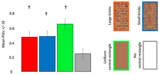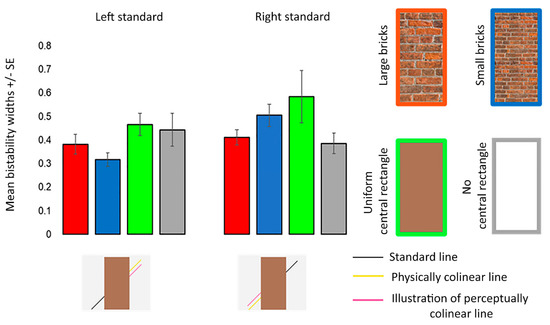 One sample t-tests revealed that the participants perceived a misalignment of the oblique lines in each condition when the standard line was presented on the left (all pcorr < 0.001) and right (all pcorr ≤ 0.022) sides. ANOVA revealed that the main effect of the Poggendorff stimulus (F (2, 29) = 8.197, p = 0.005, = 0.263, Greenhouse–Geisser corrected) but not the visual field (F (1, 23) = 0.209, p = 0.652, = 0.009) was significant. The interaction between the visual field and Poggendorff stimulus was not significant (F (2, 29) = 1.274, p = 0.278, = 0.053, Greenhouse–Geisser corrected). Post-hoc comparison tests carried out to further examine the main effect of the Poggendorff stimulus demonstrated that the no central rectangle condition produced a weaker illusion than the large brick central rectangle (t = 2.767, pcorr = 0.044, d = 0.565), the small brick central rectangle (t = 2.892, pcorr = 0.031, d = 0.590) and the uniform central rectangle (t = 4.931, pcorr < 0.001, d = 1.007) (Figure 5). There were no differences between the large and small brick central rectangles (t = 0.124, pcorr > 0.999, d = 0.025) nor were there any differences between the uniform central rectangle versus the large (t = 2.164, pcorr = 0.204, d = 0.442) and small (t = 2.039, pcorr = 0.272, d = 0.416) brick central rectangles.