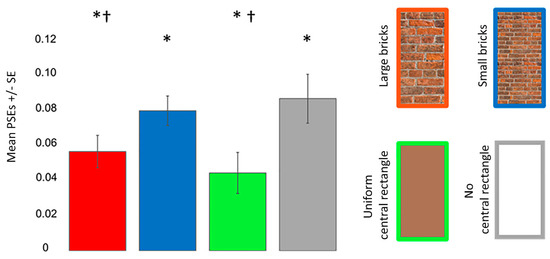Figure 7 shows the mean PSEs with error bars for each Poggendorff stimulus. One sample t-tests revealed that each Poggendorff stimulus was perceived wider than its physical width (all pcorr ≤ 0.001). ANOVA revealed that the main effect of the Poggendorff stimulus (F (3, 69) = 6.431, p < 0.001, = 0.219) was significant. Post hoc comparisons demonstrated that the no central rectangle condition was perceived to be wider than both the large brick (t = 2.739, pcorr = 0.047, d = 0.559) and uniform (t = 3.837, pcorr = 0.002, d = 0.783) central rectangles. The difference between the perceived widths of the large and small brick central rectangles was insignificant (t = 2.112, pcorr = 0.230, d = 0.431). The small brick central rectangle was perceived to be wider than the uniform central rectangle (t = 3.210, pcorr = 0.012, d = 0.655).