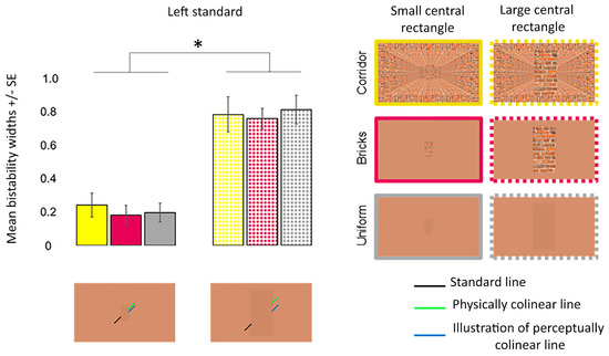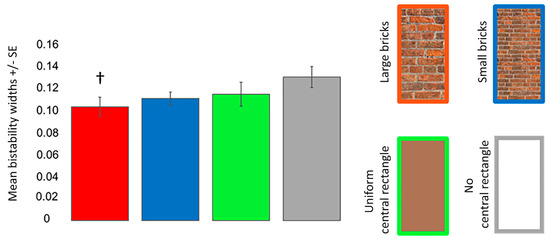 For bistability widths, ANOVA revealed that the main effect of the Poggendorff stimulus (F (2, 54) = 3.254, p = 0.039, = 0.124, Greenhouse–Geisser corrected) was significant (Figure 8). Post hoc comparison tests demonstrated that the large brick central rectangle resulted in less perceptual uncertainty than the no central rectangle condition (t = 3.025, pcorr = 0.021, d = 0.618). There were no other significant differences (all pcorr ≥ 0.192).
