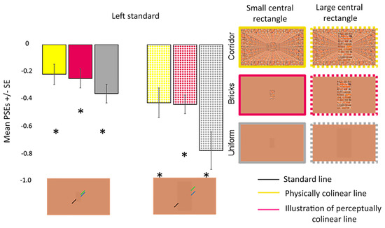 One-sample t-tests were conducted to determine if the line that was colinear to the standard appeared different from its physical position. We used the Bonferroni method to correct eight one-sample t-tests. We also performed a 2 × 4 ANOVA with the visual field ((1) left standard line, (2) right standard line) and Poggendorff stimulus ((1) large brick central rectangle, (2) small brick central rectangle, (3) uniform central rectangle, (4) no central rectangle) as within-subject factors. Before entering PSEs into the ANOVA, we multiplied −1 to values obtained when the standard was on the left such that we could compare absolute magnitudes between when the standard was on the left versus the right.