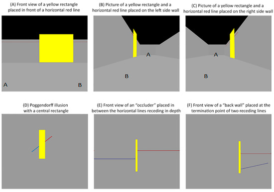 Poggendorff figures used to illustrate the possible interpretations of attached lines and central areas. Pictures of the virtual environments were taken using a virtual camera in Autodesk 3dsMax. (A) Front view of a yellow rectangle placed in front of a horizontal red line. The front view image of the yellow rectangle was taken by placing a virtual camera in between points A and B (see Video S1). (B) Side view of a yellow rectangle placed in front of a horizontal red line on the left side wall. (C) Side view of a yellow rectangle placed in front of a horizontal red line on the right side wall (see Video S1). (D) Poggendorff illusion with a central rectangle (see Video S2). (E) Front view of an “occluder” placed in between the horizontal lines receding in depth. The side view of this image was illustrated in Figure 2D (see Video S3). (F) Front view of a “back-wall” placed at the termination point of two lines receding in depth. The side view of this image was illustrated in Figure 2D (see Video S4).