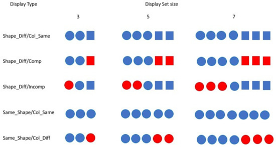 The three critical conditions were as follows and were defined with respect to particular kinds of displays (see Figure 1). In the Shape_Diff/Col_Same displays, there were two different kinds of shapes present in the same color. In the Shape_Diff/Comp displays, two different kinds of colored shapes were present; hence, type of shape and type of color were perfectly correlated (these are the so-called ‘compatible’ cases). Finally, in the Shape_Diff/Incomp displays, there were two different kinds of shapes and two different kinds of colors, but shape distinction and the color distinction did not coincide (these were ‘incompatible’ cases).