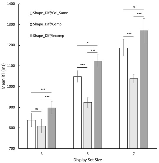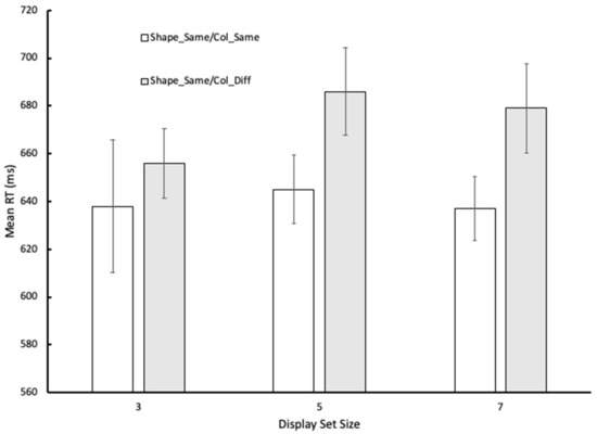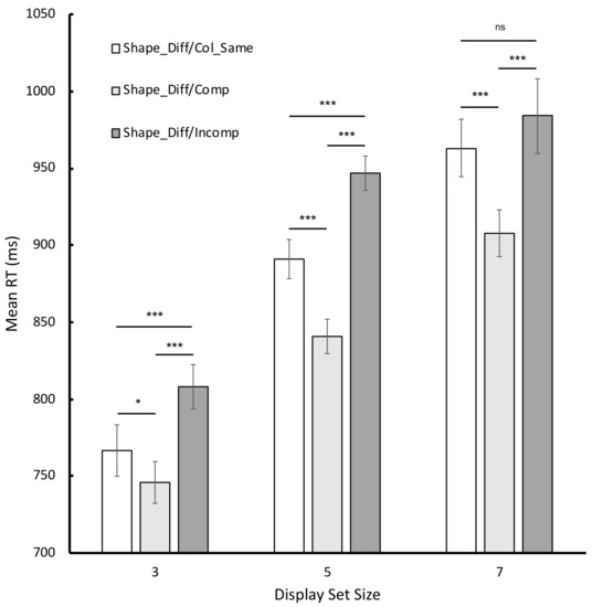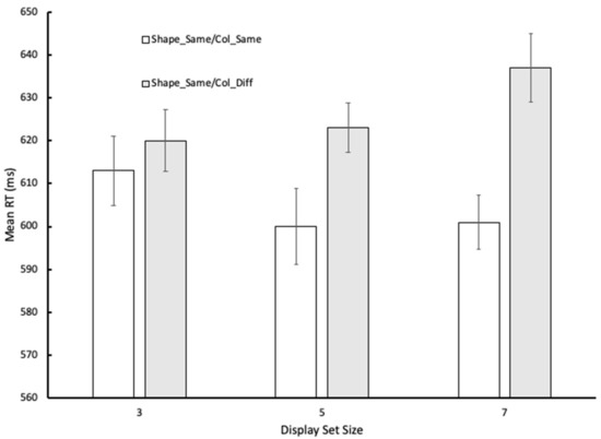 Turning to the data from the critical conditions, the corresponding mean RTs were entered into a 3 × 3 repeated-measures ANOVA in which display set size (as before) and condition (Shape_Diff/Col_Same, Shape_Diff/Compatible and Shape_Diff/Incompatible) were entered as fixed factors and participants acted as a random factor (see Figure 3 for a graphical illustration of the corresponding RT data). The analysis revealed statistically significant main effects of both display set size, F (2, 58) = 130.03, p < 0.001, = 0.82, and condition, F (2, 58) = 67.69, p < 0.001, = 0.70, and a statistically significant display set size x condition interaction, F (4, 116) = 8.85, p < 0.001, = 0.23. Results of the Bonferroni-corrected simple main effects are shown in Figure 3. Most importantly, for all three display set sizes, participants were slower to respond to incompatible cases than compatible cases (and this difference scaled directly with display set size). This critical finding favors an account of processing based on grouping rather than one that posits constraints about the sequential interrogation of functionally separate feature maps.