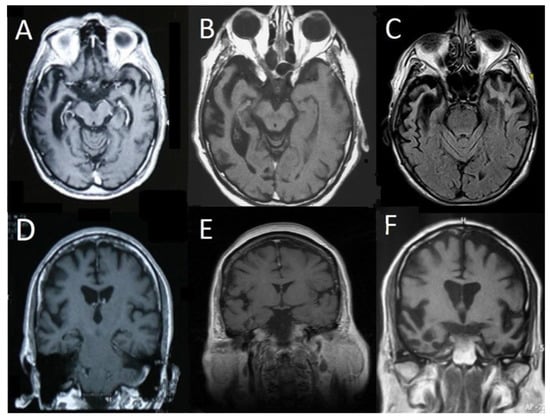 We reviewed the records of 105 patients diagnosed with FTD, examined at the Cognitive–Extrapyramidal disorders Unit of the 1st and the 2nd Neurology Department, of the National and Kapodistrian University of Athens in Greece (2009–2016). Diagnosis was made by senior neurologists specialized in cognitive disorders based on the diagnostic criteria, after a comprehensive neurological, neuropsychological, and neuroimaging evaluation. Selection criteria of rtv-FTD patients were patients with a clinical diagnosis of FTD and predominant lateral temporal lobe atrophy in their first available brain MRI. A total of 7 patients (5 men/2 women) with a clinical diagnosis of FTD and predominant lateral right temporal atrophy in MRI were detected in this sample. Clinical features of these patients were compared with those observed in a group of 22 age-matched patients (16 men/6 women) with a clinical diagnosis of FTD and predominant frontal lobe atrophy in their first available brain MRI [2]. Patients were designated as having predominant lateral right temporal or frontal atrophy according to their initial available brain MRI scans which were blindly assessed by experienced neuroradiologists as described in previous studies [8]. In the majority of cases of rtv-FTD, a certain degree of bilateral temporal lobe atrophy was present with a marked predominance of atrophy on the right side (Figure 1).