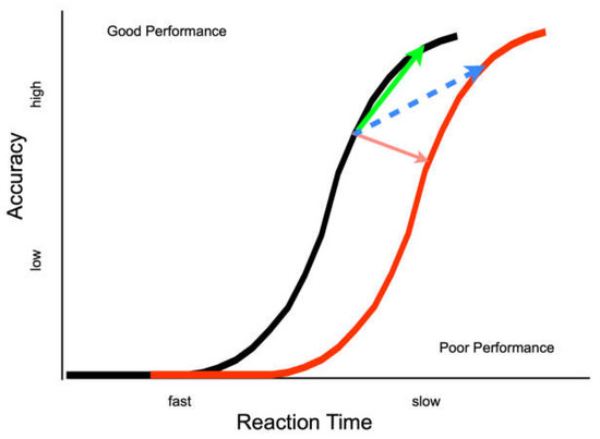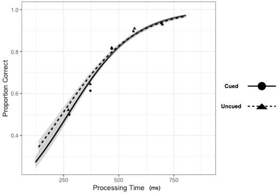 These results suggest that input processing at cued and uncued locations is quite similar, with the proportion of correct discrimination responses being accounted for by a single information accrual function. This result would be expected if output-IOR were expressed purely as a criterion shift or post-perceptual effect. Further, since the same overt response was required at the same time to the same cue as in Experiment 1, the lack of a statistical cueing effect cannot be taken easily to suggest that there was no inhibitory consequence of the cue (i.e., IOR). That is, without the response signal methodology, these procedures robustly reveal that responses are slower when the target location is cued as compared to uncued. This pattern is qualitatively different from those reported by Ivanoff and Klein [29]. Eye movements to the cue were discouraged in their experiments, and they found IOR shifted the SAT function rightward (see [29]—Figure 5, see also [31]), consistent with the idea that IOR delayed the accrual of non-spatial (but task-relevant) information accrual (represented theoretically in the shift from black to red functions in the present Figure 1).