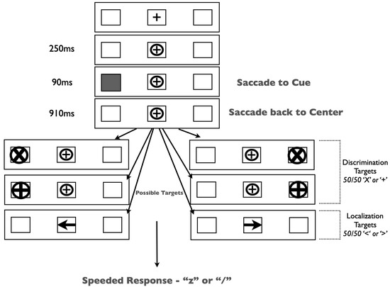 The experiment was run in a dimly lit room on a 19” CRT monitor. Gaze position was monitored continuously by EyeLink II head-mounted eye tracking equipment. Our stimuli and procedure (Figure 2) were identical to those in Redden, Hilchey and Klein [15] except for a single change: participants were presented with one of two target types on each trial—peripheral x/+ discrimination or central left/right arrow targets.