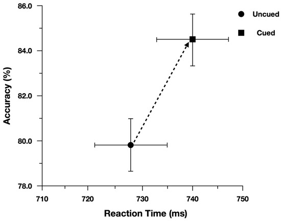 Reaction time to arrow targets. Performance to cued and uncued targets is represented on the x-axis. Error bars represent Fisher’s least significant difference.