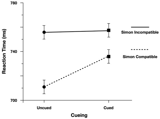 Reaction time to discrimination targets split by Simon Compatibility (solid line = Simon Compatible; dashed line = Simon Incompatible). Performance to cued and uncued targets is represented on the x-axis. Error bars represent Fisher’s least significant difference.