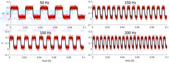 Several calibration procedures were carried out on the experimental setup. Firstly, to confirm that the frequency of the flicker of the luminous output was equal to the input frequency, luminance measurements were taken with a photodiode connected to an oscilloscope (PicoScope 2000). All frequencies between 20 and 200 Hz, in steps of 10 Hz, were tested for 100 ms with 32 repetitions at each frequency. Some examples of these measurements are shown in Figure 2. All repetitions were averaged, and the resulting period was obtained and fitted in a linear regression against the input period. The resulting slope was equal to 1 and the intercept was 0.37 ms; thus, indicating a very good agreement between input and output.