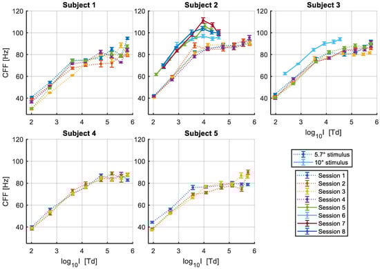 Estimated CFFs as a function of log10 retinal illuminance. Error bars represent the standard error of the CFFs obtained through parametric bootstrap analysis. Different sessions are represented with different colors. The dotted lines represent CFFs obtained for a stimulus of 5.7 degrees of visual angle, and the continuous lines for a stimulus of 10 degrees of visual angle.