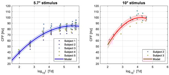 Quadratic linear mixed model results of CFF as a function of log10 retinal illuminance, for stimulus sizes of 5.7 (left) and 10 (right) degrees of visual angle. The continuous colored lines represent the model fit and the shaded regions represent the 95% confidence intervals. The individual markers show the estimated thresholds for each subject over several experimental sessions, and the color of the markers represents the participant as indicated by the legend.