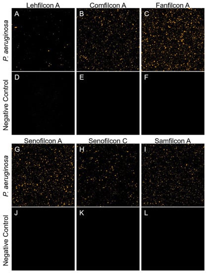 Qualitative assessment of P. aeruginosa’s adherence to soft contact lenses. Confocal microscopy of contact lenses treated with TAMRA-stained P. aeruginosa strain ATCC 10145 (A–C,G–I) or mock treated with sterile PBS (D–F,J–L). Bacteria are visible as foci attached to the surface of lehfilcon A (A), comfilcon A (B), fanfilcon A (C), senofilcon A (D), senofilcon C (E), or samfilcon A (F). A 0.42 × 0.42 mm field of view from the center of each contact lens is shown.