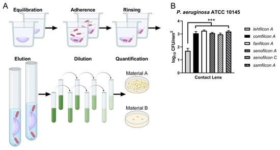Quantitative adhesion assays were performed to evaluate the density of P. aeruginosa adhered to contact lens surfaces. Equilibrated contact lenses were transferred into 12-well plates containing P. aeruginosa at 106–107 CFU/mL in PBS. P. aeruginosa adhered to the contact lenses for 2 h at 30–35 °C during agitation at 100 RPM. Three sequential 1 min rinses in PBS were performed at 30–35 °C, 100 RPM. Lenses were then transferred into 10 mL PBS supplemented with 0.05% polysorbate 80 and vigorously vortexed for 2 min to elute P. aeruginosa. Live organism recovery from each lens was quantified by dilution plating, as described above. A schematic of this procedure was created with BioRender.com.